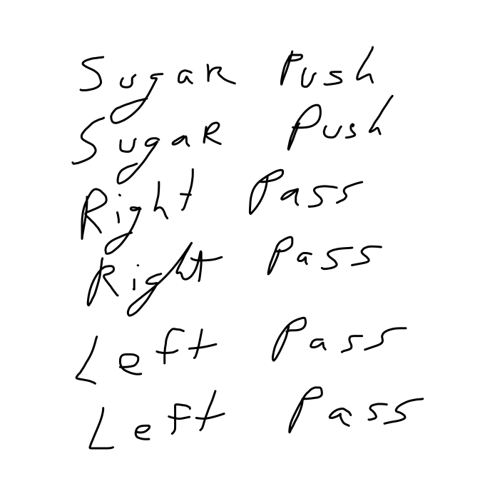 Intermediate Notation: This method already shows an abbreviation for the number of times something occurs while retaining the full imprint of the name of the pattern. This method is also good and can contain more detail as needed. Issues arise if there is any difference between the first Sugar Push and the second Sugar Push.